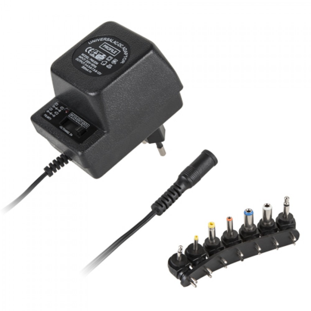 Alimentator stabilizat, current maxim 300 mA. Tensiune de iesire reglabila in trepte: 3, 4.5, 6, 7.5, 9 si 12V. Polaritatea tensiunii de iesire se poate inversa. Are 6 tipuri de mufe de alimentare DC: 5,5 x 2,5 mm 5,5 x 2,1 mm 5 × 1,5 mm 4 x 1,7 mm 3,5 x 1,35 mm 2,35 x 0,75 mm