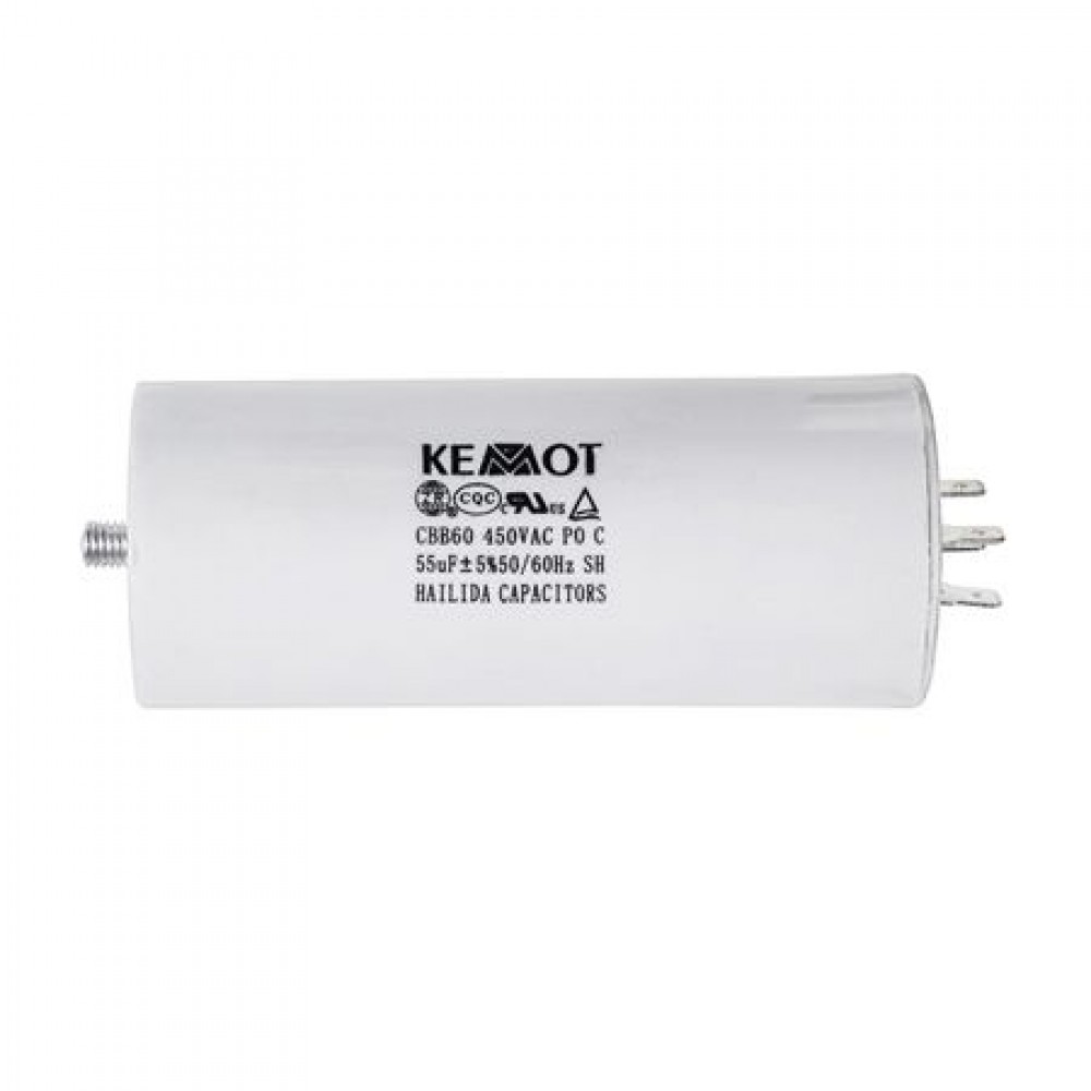 Condensator pentru motor monofazat, cu surub, pentru aplicaþii cum ar fi: frigidere, ventilatoare, pompe electrice, motoare electrice, etc. Specificatii: - Capacitate: 60 uF - Toleranta: + / -5%, + / -10% - Tensiune de operare: 450 VAC - Gama de temperatura: - 40 grade C ... 70 grade C - Clasa: Clasa C / D, IEC60252 - Stabilitate mare - Rezistenþa de izolaþie mare - Inaltime: 130 mm - Diametru: 55 mm - UL 94 VO, carcasă cilindrică din material plastic ignifug