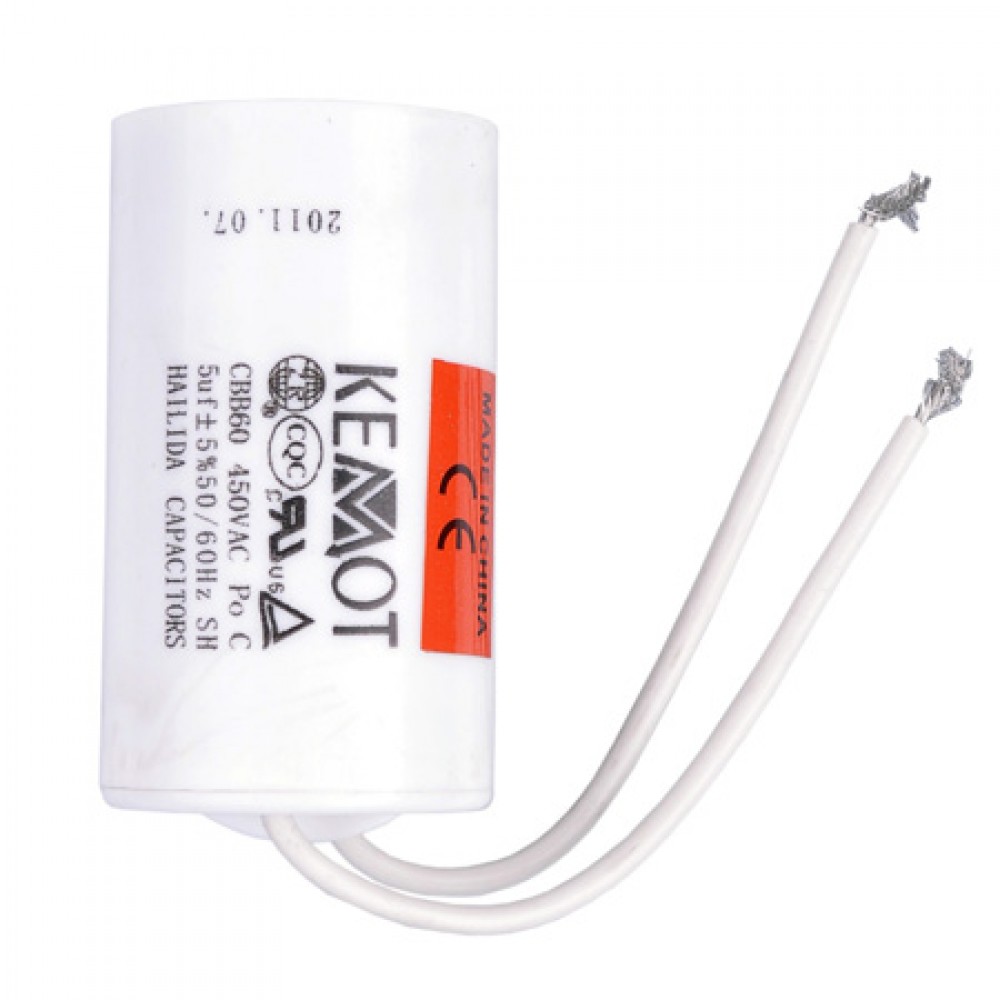 Aplicatii: frigidere, ventilatoare, pompe electrice, spalator presiune, ventilatoare, etc. Specificatii: - Capacitate: 5uF - Toleranta: + / -5%, + / -10% - Tensiunea de operare: 110V - 600V AC - Temperatura: - 40 grade C ... 70 grade C - Clasa: Clasa C / D IEC60252 - Rezistenta mare de izolatie - Dimensiuni reduse - inaltime: 60 mm - diametru: 35 mm - carcasa cilindrica din material plastic ignifug UL 94 VO - conectare cu fire